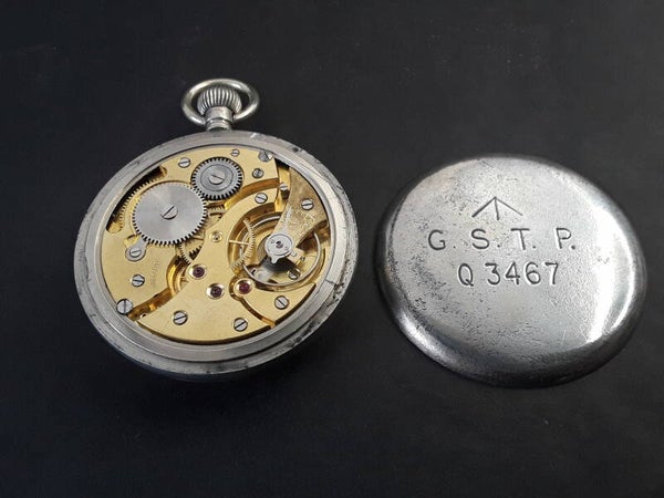 The pocket watch has G.S.T.P marks on the back, these initials stand for General Service Temporary (or Trade?) Pattern. Also on the back you can see the military Broad Arrow and the service issue number Q3467.