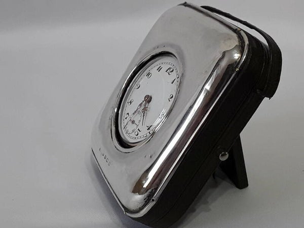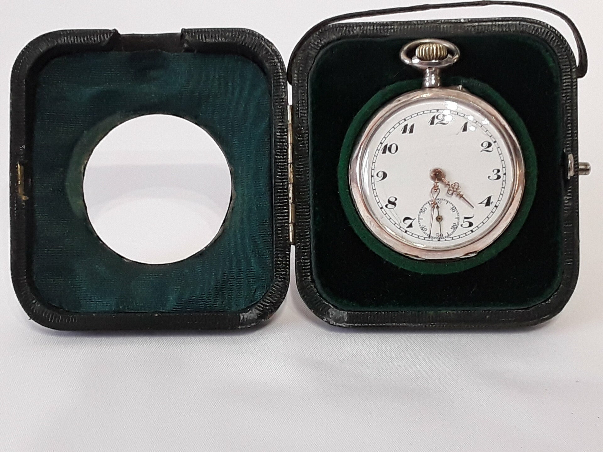 Sterling silver fronted pocket watch stand hallmarked for Birmingham (n)1912 with a Swiss top winding pin set pocket watch in working order. The pocket watch stand has a silver front with a green leather looking back which has a folding stand.