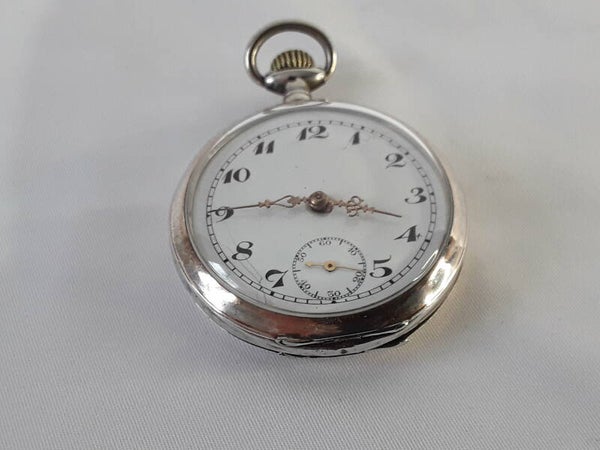The overall condition of the pocket watch is fair with the silver case having a few dings around the edge and back, it has a fairly clean face with just a few hairline cracks, a nice clear glass and good hands.